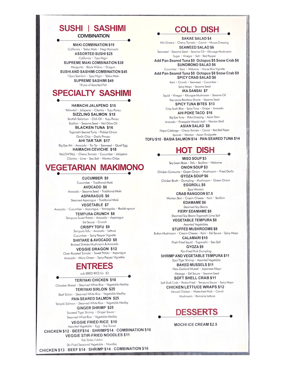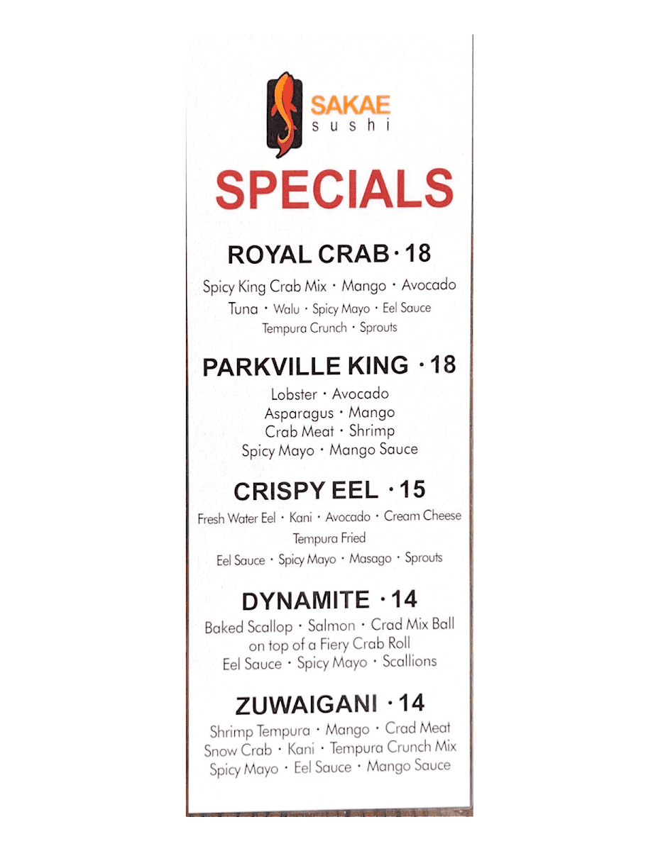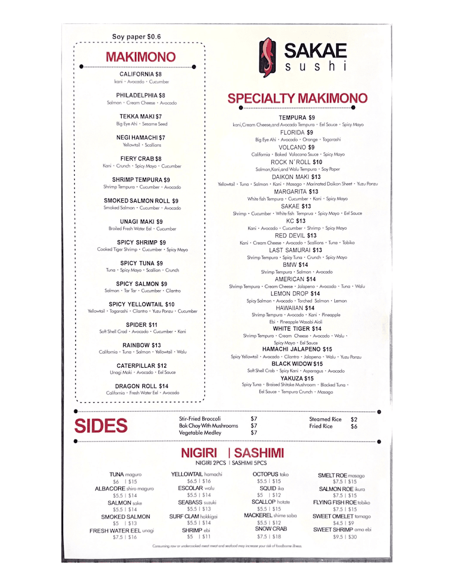 The atmosphere at Sakae Sushi matches the menu’s approachable style—welcoming and laid-back, where diners can appreciate both speedy service and the experience of watching skilled chefs at work. Whether you stop by for a quick bite or settle in for a leisurely meal, the menu encourages moments of simple enjoyment paired with understated flavors and fresh ingredients.